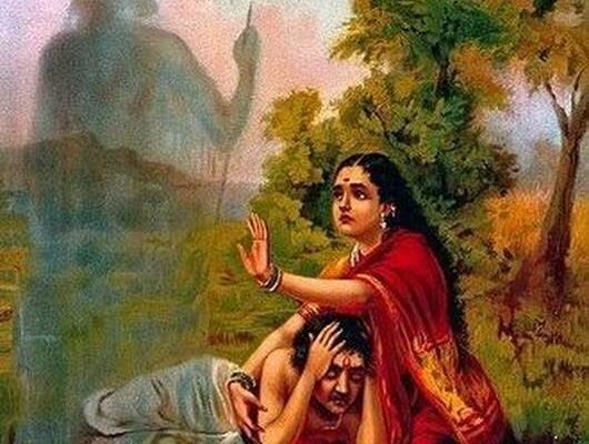 आज मृत्यु का अंतिम दिन था. सत्यवान को भयंकर पीड़ा और चक्कर आने लगे. वो जमीन पर गीर पड़ा. उसने जगाने का प्रयत्न किया मगर नहीं उठे. तब उसने देखा स्वयं यम प्रकट हुए, जो काल रूपी भैंसे पर सवार यमराज था.